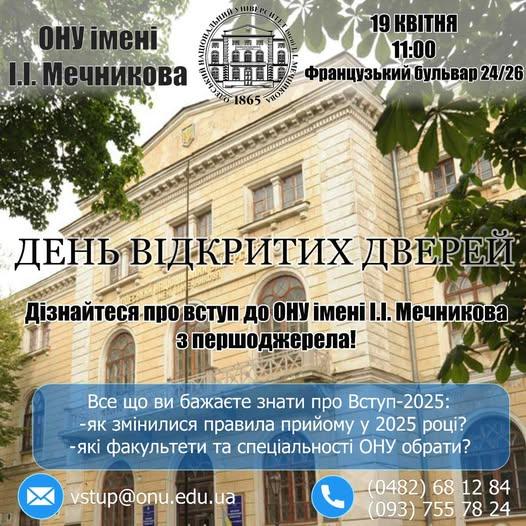 20 квітня 2024 року будемо раді бачити Вас за адресою Французький бульвар, 24/26, корпус гуманiтарних факультетiв.